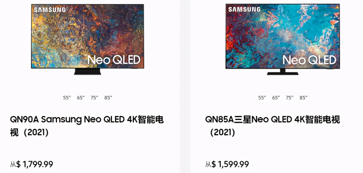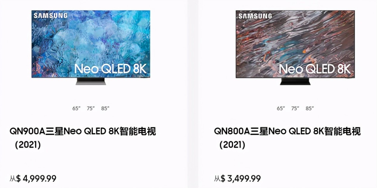 在这次三星电视本年度新品发布会上,可以明显看到,Neo QLED 8K(Neo量子点处理器和新型量子点Mini LED背光源)电视将是三星今年的主打产品,推出了4k~8K等多个系列型号,在尺寸上覆盖了从55寸~85寸多个产品尺寸区间,其中三星Neo QLED 8K电视(型号QN900A和QN800A)尺寸有65'' 75'' 85'',售价分别是3,499.99美元(折合人民币约2.3万元)和4,999.99美元(折合人民币约3.2万元)。而4K电视(型号QN90A和QN85A)尺寸有55'' 65'' 75'' 85'',售价相对便宜,分别是1,799.99美元(折合人民币约1.2万元)和1,599.99美元(折合人民币约1万元)。