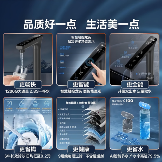 鲜矿水3.0技术让出水口感清甜,适合泡茶、冲饮,兼顾健康与风味;彩色智能触控龙头搭配极简机身,颜值在线,能完美适配开放式厨房、嵌入式橱柜,不会显得突兀,兼顾健康、颜值与实用性。